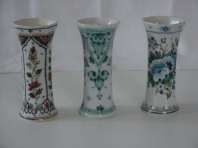 Polychrom von 1986Höhe: 13,5 cmMaler: J, Rijneveen (1976-1993)Delvert von 1991Höhe: 13,5 cmMaler: J.H. v. Willigen (1947-1994)Delflore von 1989Höhe: 13,5 cmMaler: J. de Reuver (1978)